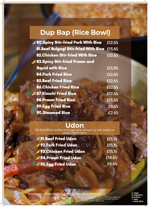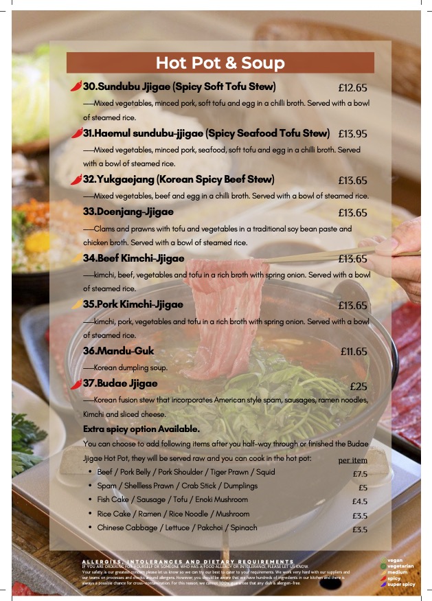 Kimchi, beef, seafood, vegetable and tofu in a rich broth with spring onion. Served with a bowl of steamed rice.